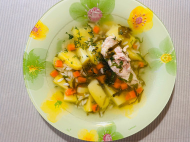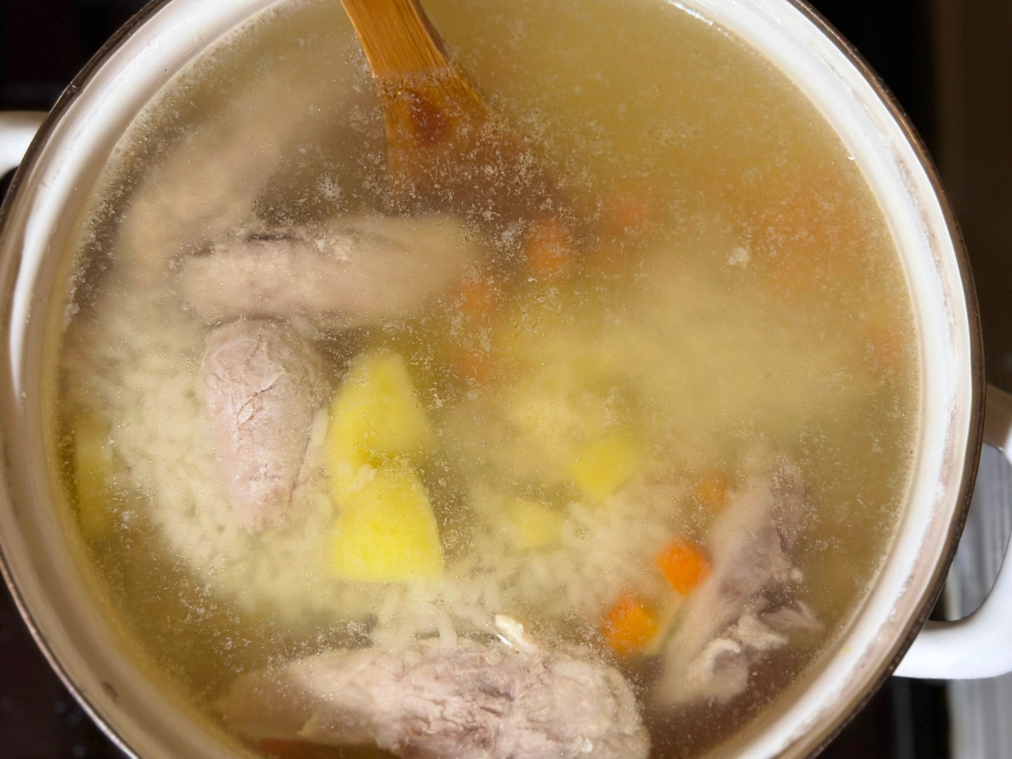 Предложенный рецепт супа - отличный пример того как из простых продуктов, можно приготовить вкусное и интересное блюдо. А возможность сделать его не только на мясном бульоне, но и постным - замечательное решение для тех, кто следит за своим питанием или соблюдает пост 🔥 Приготовив бульон из индейки, я его процедила. Картошку и морковь я запускаю вместе в бульон, лук у меня не любят. Все крупы всегда варю отдельно, чтобы сохранить прозрачность бульона. Морская капуста у меня покупная, уже продавалась с чесноком. Когда картофель и морковь сварились, добавила приготовленный рис, морскую капусту, зелень, перец горошком и лавровый лист. Получилось очень вкусно, спасибо, Аля, Вам за такой рецепт 😍