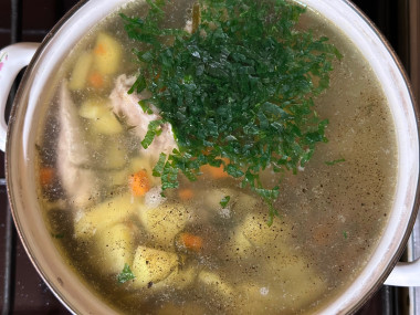 После закипания супа, отправить лавровый лист, чеснок и зелень в кастрюлю. Попробовать на соль и досолить при необходимости. Перемешать и сразу снять с огня.