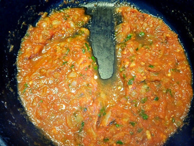 Готовый соус имеет насыщенный красно - оранжевый цвет. Проведите лопаткой по дну сковороды, если образуется дорожка и тут же смыкается - консистенция правильная, гуще уваривать не надо. Вкус соуса томатный, кисло - сладкий, с выраженной чесночной ноткой. Присутствует острота, но не жгучая, небольшой медовый привкус и аромат трав. Палитра вкуса многогранна, но всё в меру и сочетание гармонично.