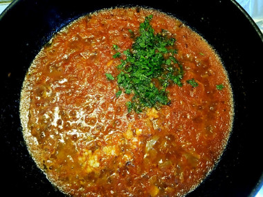 Затем измельчённую зелень. / Я добавила по паре веточек укропа и кинзы, только самые нежные листики, без стеблей. Зелень можно заменить по предпочтению, но лучше вкус будет со свежей/. Перемешать, попробовать на вкус и при необходимости добавить соль, перец, чеснок. Затем вернуть на тёплую плиту и немного прогреть, не давая закипать.