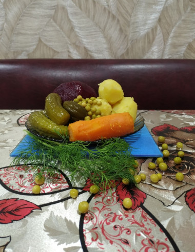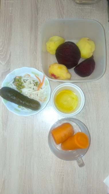 Калорийность продуктов: Картошка, Морковь, Свекла, Соленые огурцы, Капуста квашеная, Зелёный горошек, Лук репчатый, Растительное масло, Столовый уксус, Сахар, Соль