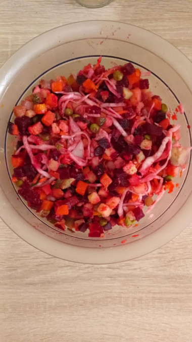 Несмотря на то, что у нас на улице +15 градусов тепла, мой муж сказал: « Вот уже поздняя осень наступила, и я объявляю сезон зимних салатов». Ну, раз уж «объявил»))), так тому и быть. Как раз сегодня созрела первая трёхлитровая банка квашеной капусты. И, конечно, выбор пал на винегрет. Очень кстати пришелся рецепт Snezhana.