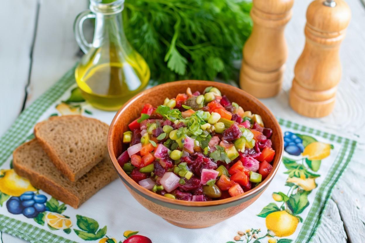 Винегрет — салат русской кухни с французским названием (от vinaigrette — уксусная заправка). Популярность приобрел в СССР как доступный, сытный и долгохранящийся салат. Классический рецепт с солеными огурцами и зеленым горошком был эталонным для столовых и домашних застолий.