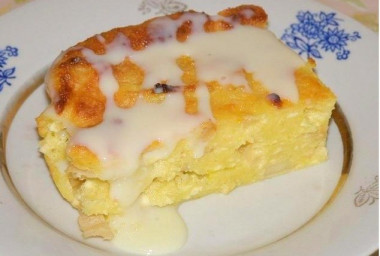 Готовая запеканка будет слегка румяная. Форму вытащите из духовки и дайте постоять минут 5, чтобы вышел жар. Затем нарежьте на порционные кусочки, разложите по тарелкам и подавайте к столу. В дополнение к запеканке можно подать сметану, сгущенное молоко или джем. Приятного аппетита!