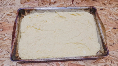 Готовую творожную массу выложите в подготовленную форму для запекания. Равномерно распределите массу по всей поверхности.