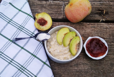 Овсянка на завтрак - это отличное начало дня! Она сытная и вкусная, особенно с фруктами. Я использовала крупу быстрого приготовления, она варится буквально минуту. Мне и детям она больше нравится из-за более нежной и однородной текстуры. Добавление сливочного масла придало овсяной каше сливочный вкус. Густота получилась в самый раз, не жидкая и не слишком густая. Количество продуктов точно рассчитано на две порции. Из фруктов я добавила свежие персики, что особенно порадовало дочку)