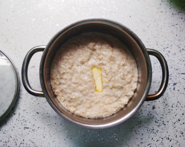 Когда каша готова, добавьте в кастрюлю сливочное масло. Перемешайте, чтобы растопленное масло равномерно разошлось по каше. Снимите кастрюлю с огня, накройте крышкой и поставьте упариваться на 10-15 минут.