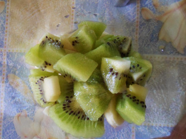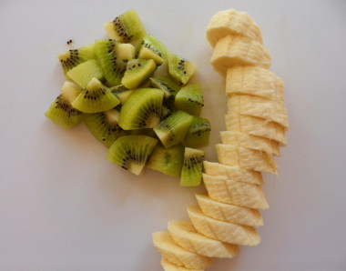 Киви очистите от кожуры и нарежьте небольшими кусочками. Как правильно выбрать киви? Выбирайте упругие, но не жесткие плоды. Слишком твердые киви скорее всего еще не дозрели и будут очень кислыми и недостаточно сочными, а слишком мягкие могут оказаться забродившими. И то, и другое отрицательно скажется на вкусе готового напитка.