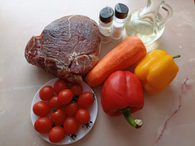Калорийность продуктов: Говядина, Морковь, Лук, Болгарский перец, Помидоры, Соль, Специи сухие, Растительное масло