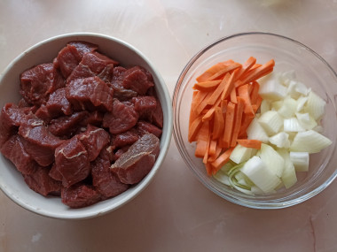 Как сделать говядину тушёную с овощами в мультиварке? Мякоть говядины нарежьте крупными кусочками поперёк волокон.