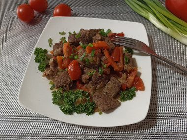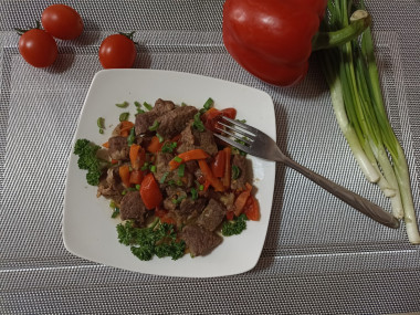 Через 40-50 минут после начала тушения можно попробовать мясо на готовность и заодно на соль и на специи. Возможно, что к этому времени оно уже будет готово. Если же вы хотите, чтобы мясо стало более мягким, то ждите финального сигнала. Наше блюдо можно подавать к столу! Приятного аппетита!