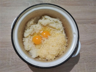 Вбейте в миску со слегка охлажденным мятым картофелем яйца и добавьте натертый на крупной терке твердый сыр. Яйца лучше использовать домашние, тогда тесто приобретет насыщенный желтый цвет, а готовое блюдо будет более вкусным. Перед применением яйца нужно обязательно помыть содой, так как на их поверхности могут быть вредные бактерии.