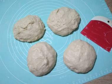 Из получившегося теста выйдут четыре небольшие лепешки, поэтому визуально разделите его на 4 части и из каждой скатайте колобок.