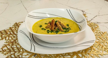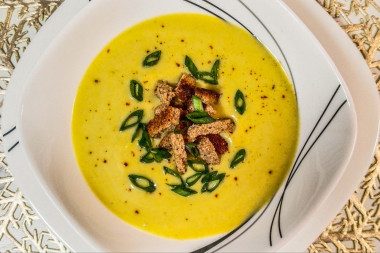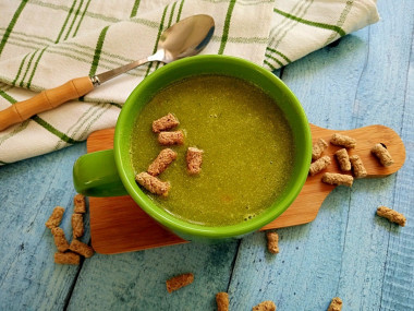 Готовый суп-пюре разлейте по тарелкам и подавайте к столу. Идеальным дополнением станут сухарики из хлеба. Их можно сделать, просто немного обжарив хлеб на сухой сковороде или с добавлением небольшого количества растительного масла. Приятного аппетита!