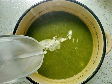 Затем добавьте в кастрюлю брокколи, лук и зеленый горошек. Если овощи были заморожены, то их размораживать необязательно. Можно сразу опускать в суп. Проварите все вместе еще минут 10. По вкусу подсыпьте немного соли. Можно добавить сухие травы.