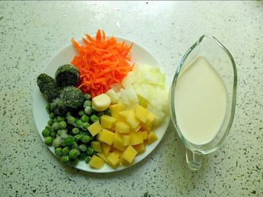 Как сварить овощной суп-пюре со сливками для ребенка? Подготовьте для этого необходимые ингредиенты. Набор овощей и их количество может быть любым. Ориентируйтесь по своему вкусу и по возрасту ребенка. Овощной суп можно приготовить на воде или на бульоне. Оптимальным вариантом будет легкий куриный бульон. Картофель, лук и морковь заранее очистите и ополосните от загрязнений.