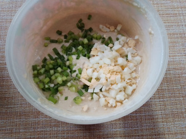 Тщательно промойте зелёный лук и мелко его нарежьте. Яйца тоже нарежьте на маленькие кубики.