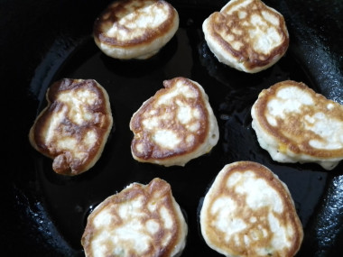На сковороде разогрейте растительное масло. Выложите на сковороду столовой ложкой несколько порций теста. Жарьте пирожки на среднем огне в течение 2-3 минут с каждой стороны до золотистого цвета.