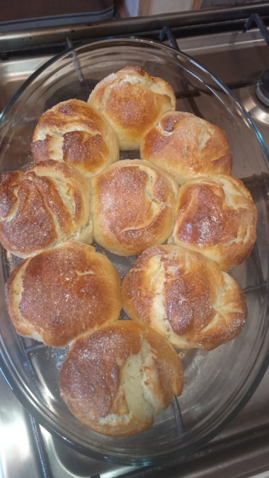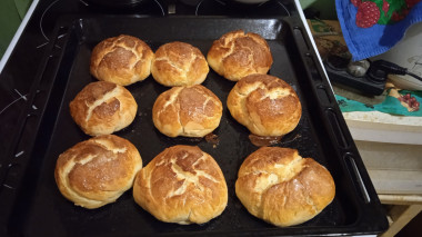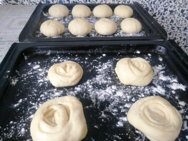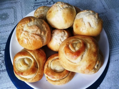 Из указанного в рецепте количества молока и муки у меня получилось восемь небольших булочек и четыре плюшки.