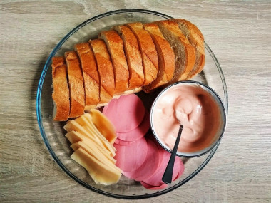 Смешайте кетчуп и майонез. Этой смесью нужно намазать каждый кусочек батона с двух сторон. Для того чтобы батон с сыром и колбасой получился еще более вкусным, можно добавить пару долек чеснока. Измельченный чеснок добавьте к смеси майонеза и кетчупа.