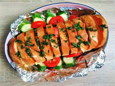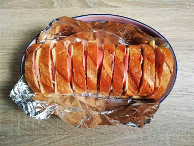 Возьмите подходящую форму для запекания и застелите ее фольгой. Если нет такой формы, то можно запекать на противне. Из фольги сформируйте нужную форму для батона. Между каждым кусочком батона разложите по куску сыра и колбасы. Как вариант можно еще добавить и помидор, нарезанный кружками. Мне кажется, что от такой овощной добавки блюдо только выиграет.