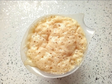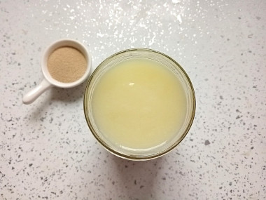 Возьмите 150 мл теплого картофельного отвара. Обратите внимание, что отвар не должен быть горячим. Иначе дрожжи просто «сварятся». Насыпьте в отвар сухие дрожжи. Перемешайте. Оставьте на 10 минут, чтобы дрожжи проснулись.