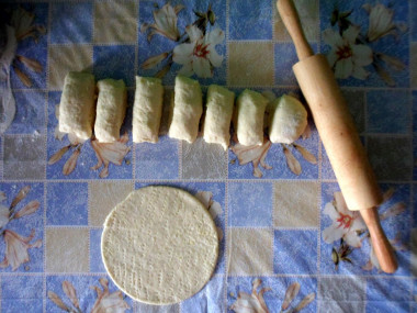 Подпыляем стол мукой и формируем несколько шариков (их количество зависит от желаемого размера самой лепешки) в среднем получается 6-7 готовых картофельных лепешек. Каждую порцию обильно обваливаем в муке и раскатываем в блинчик с помощью скалки. Если хочется приготовить побыстрей, просто прихлопываем ладонью.