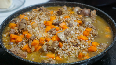 Влейте горячую воду, накройте сковороду крышкой и тушите блюдо на умеренном огне 20 минут до полного разбухания и готовности гречки.