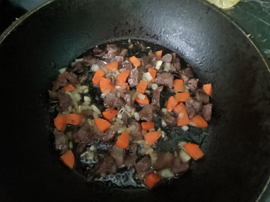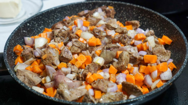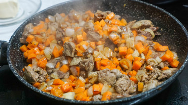 Добавьте к печени лук и морковь и обжарьте все вместе еще 5 минут также на сильном огне.