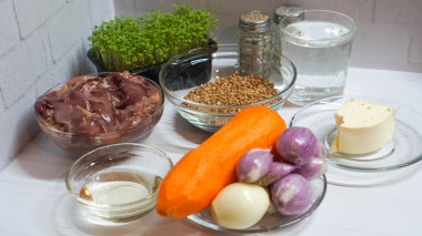 Калорийность продуктов: Гречка, Куриная печень, Лук, Морковь, Вода, Сливочное масло, Соль, Растительное масло