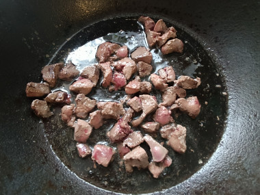 Печень нарежьте на кусочки средней величины: примерно на 4 кусочка каждую. Также нужно обрезать лишние жилки и убрать остатки желчного пузыря, если таковые имеются.