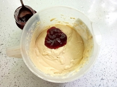 В отдельную посуду вливаем кефир комнатной температуры и добавляем варенье или повидло - я брала яблочное. От вида варенья будет зависеть цвет и вкус торта. Перемешиваем миксером на малых оборотах до однородности.