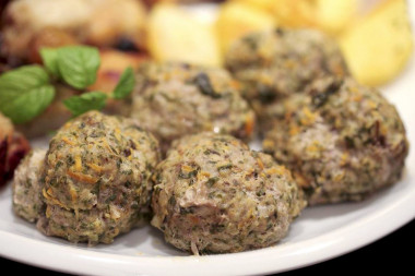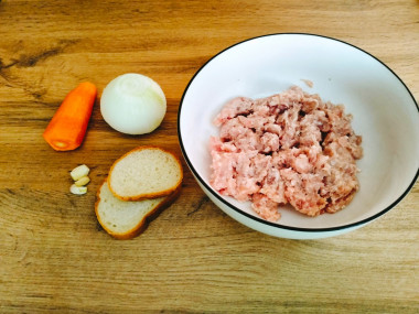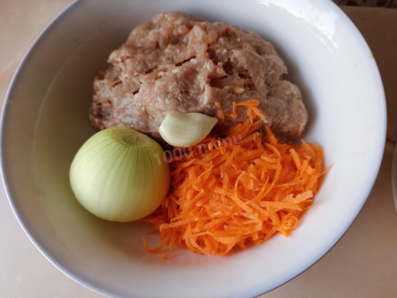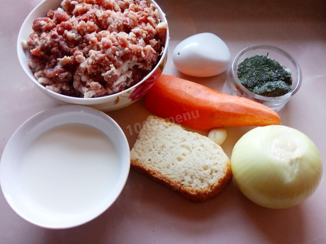 Калорийность продуктов: Фарш мясной, Лук, Морковь, Чеснок, Зелень, Батон, Молоко, Соль, Вода