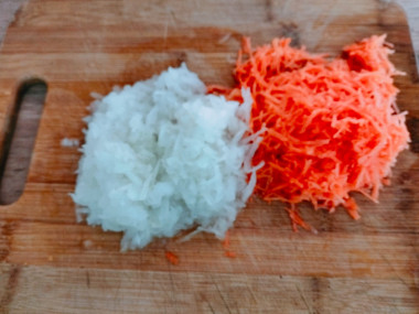 Лук и чеснок очистите от шелухи, вымойте, просушите и измельчите любым удобным способом: мелко порубите их ножом либо измельчите блендером вместе. Добавьте овощи к фаршу. Также можно пропустить лук и чеснок через мясорубку с мясом, если делаете фарш самостоятельно. Морковку вымойте, очистите и натрите на мелкой терке, также переложите потом к фаршу.