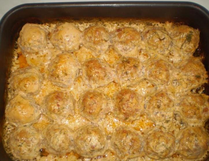Соединив все ингредиенты, тщательно перемешала фарш, сформировала ежики и выложила их в форму для запекания. Залила соусом из сметаны, майонеза и томатной пасты. Добавила в соус немного воды, чтобы он не был слишком густым.
