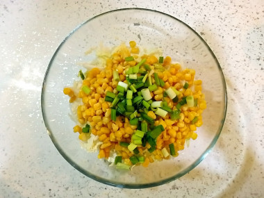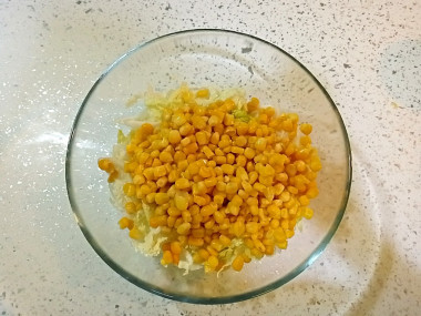 Откройте банку консервированной кукурузы, слейте сок, но не промывайте кукурузу водой. Добавьте её к смеси капусты и лука. Не мните китайскую капусту руками с солью, так она останется хрустящей, упругой и нежной.