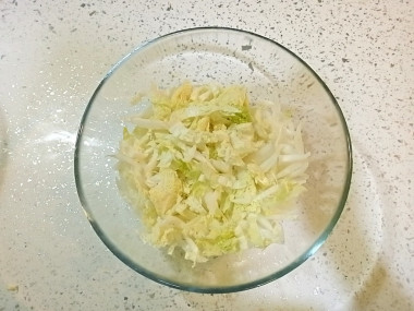 Очистите китайской капусты от верхних листьев и мелко нашинкуйте. Следите, чтобы кусочки не были слишком крупными — так салат получится более нежным и красивым при подаче.