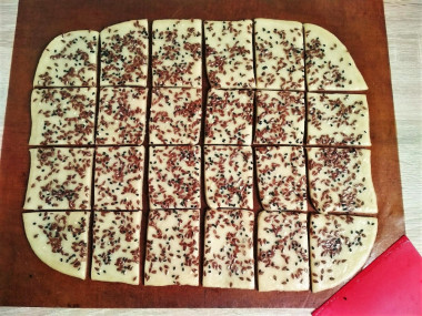 В стакане соедините очищенные подсолнечные семечки, семена льна, кунжута. Густо посыпьте поверхность будущего печенья смесью семян. Прокатайте сверху скалкой, это позволит зернам хорошо прилипнуть к тесту и не отваливаться от готового печенья. Обычным ножом, круглым резаком для пиццы или фигурным ножом для нарезки печенья разрежьте раскатанное тесто на квадраты или на кусочки другой формы.