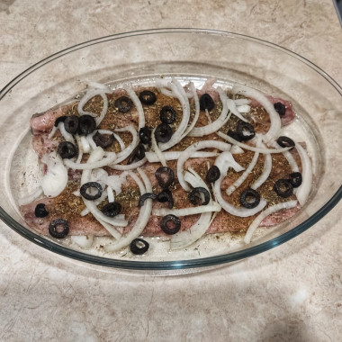 Выложите поверх рыбы кольца лука, разложите нарезанные маслинки.
