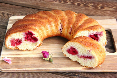 Добавить в тесто малину. Очень аккуратно перемешать, стараясь не подавить ягоды.