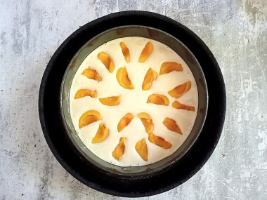 Абрикосы разрезала на 4 части. Сначала в форму выложила половину теста, затем разложила фрукты. И еще один слой повторила. Правда абрикосы тяжелее бисквитного теста, они обычно опускаются вниз.