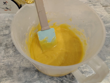 Всыпьте просеянную муку и соду, которую надо погасить лимонным соком. Аккуратно перемешайте тесто лопаткой, лучше возьмите силиконовую, она не будет нарушать структуру взбитых яиц. Мешайте не долго, надо просто размешать муку до однородности. Муки может потребоваться меньше или больше, смотрите по консистенции теста. О свойствах муки читайте в отдельной статье под шагами. Тесто должно получится как густая сметана.