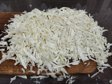 Пока лук и морковь жарятся займитесь подготовкой капусты. Тонко нашинкуйте её с помощью острого ножа. Можно капусту немного помять руками. Она станет мягче и быстрее приготовится.