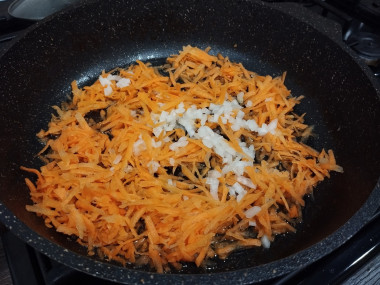 Для жарки удобно использовать глубокую сковороду с плоским дном и высокими бортами. Разогрейте её до горячего состояния и налейте немного растительного масла. Выложите измельченные лук и морковь. Обжаривайте овощи 2-3 минуты на небольшом огне, периодически помешивая.