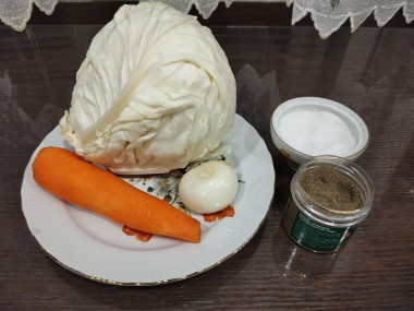 Как пожарить капусту на сковороде? Подготовьте для этого необходимые ингредиенты. Размер лука и моркови выбирайте на свой вкус. Я использую среднего размера. С кочана капусты снимите верхние листики, которые поврежденные и не пригодные к употреблению. Это обычно 2-3 листа.