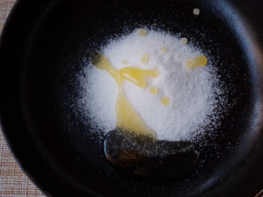 Далее возьмите сковороду, лучше всего подойдет чугунная или железная. Не берите только эмалированную и с антипригарным покрытием. Приготовьте карамель. Как сделать карамель? Высыпьте сахар на сухую горячую сковороду, добавьте к нему мед и подождите, чтобы сахар начал плавиться.