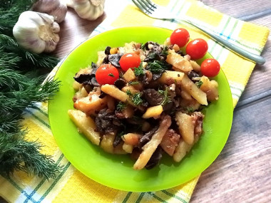 Когда картошка жарится не сама по себе, а с шампиньонами, например, она не будет идеально целой и румяной. Зато какой же вкусной становится картошечка, пропитанная грибным соком! Блюдо сытное, невероятно ароматное и аппетитное! Я подавала его с домашними маринованными помидорами, по-моему идеальное сочетание.