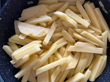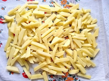 Очищенный картофель нарежьте соломкой и промойте в холодной воде. Для чего промывать картофель? Это необходимо для того, чтобы смыть с него лишний крахмал. Промытый картофель будет меньше разваливаться при жарке.