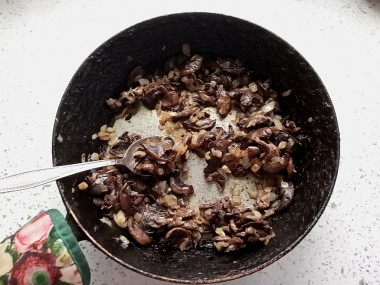 Затем добавьте в сковороду нарезанные шампиньоны. Перемешайте их вместе с луком. Обжаривайте все вместе еще 3-4 минуты.