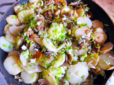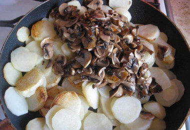 Теперь можно добавить в сковороду промытый картофель. Перемешайте его вместе с грибами и луком. Жарьте все на небольшом огне, периодически помешивая, минут 15-20. Если хотите получить поджаренный картофель с корочкой, то не накрывайте крышкой. А если более мягкий и пропаренный, то готовьте под крышкой.